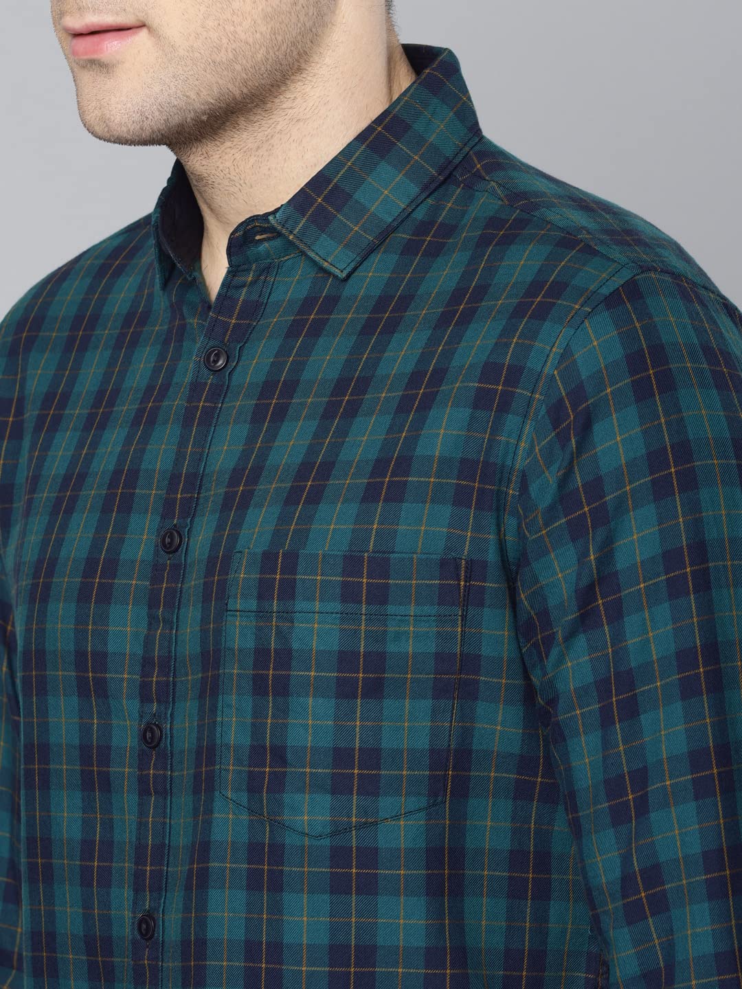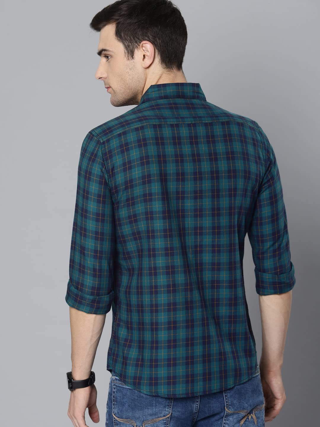 Dennis Lingo Men’s Teal Blue Checks Spread Collar Slim Fit Casual Shirt
